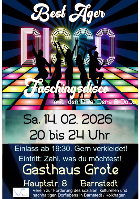 | 14.02.2026 | 19.30-24.00 | Best Ager Faschingsdisco | Gasthaus Grote | Paul |