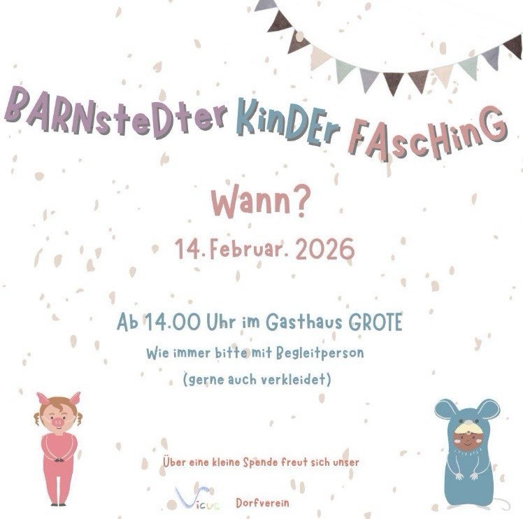 | 14.02.2026 | 14.00 | Kinderfasching (bitte mit Begleitperson) | Gasthaus Grote | Ida, Rosa, Robert, Lorenz |