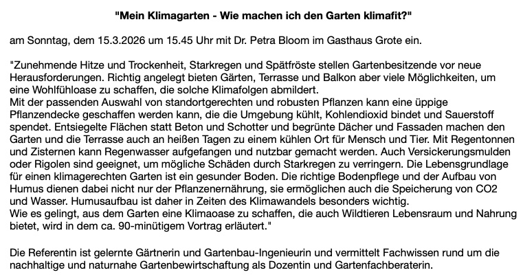 | 15.03.2026 | 15.45-17.30 | Vortrag: Gärtnern im Klimawandel – Wie machen wir unsere Gärten klimafit (Dr. Petra M. Bloom) | Gasthaus Grote | Martin S. |
