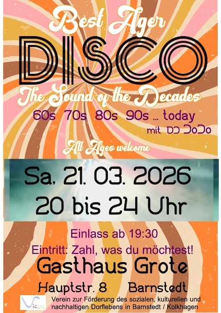| 21.03.2026 | 19.30-24.00 | Disco | Gasthaus Grote | Paul |