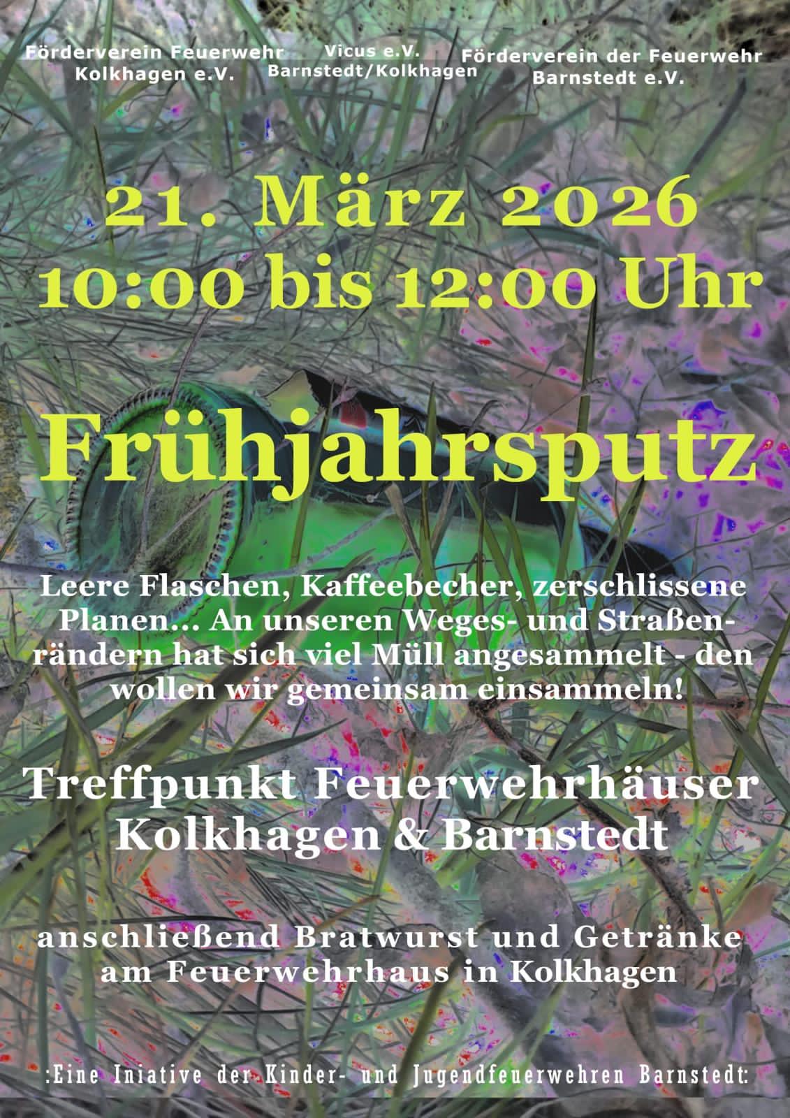 | 21.03.2026 | 10.00-12.00 | Frühjahrsputz | Feuerwehrhäuser Barnstedt und Kolkhagen | Martin L. |